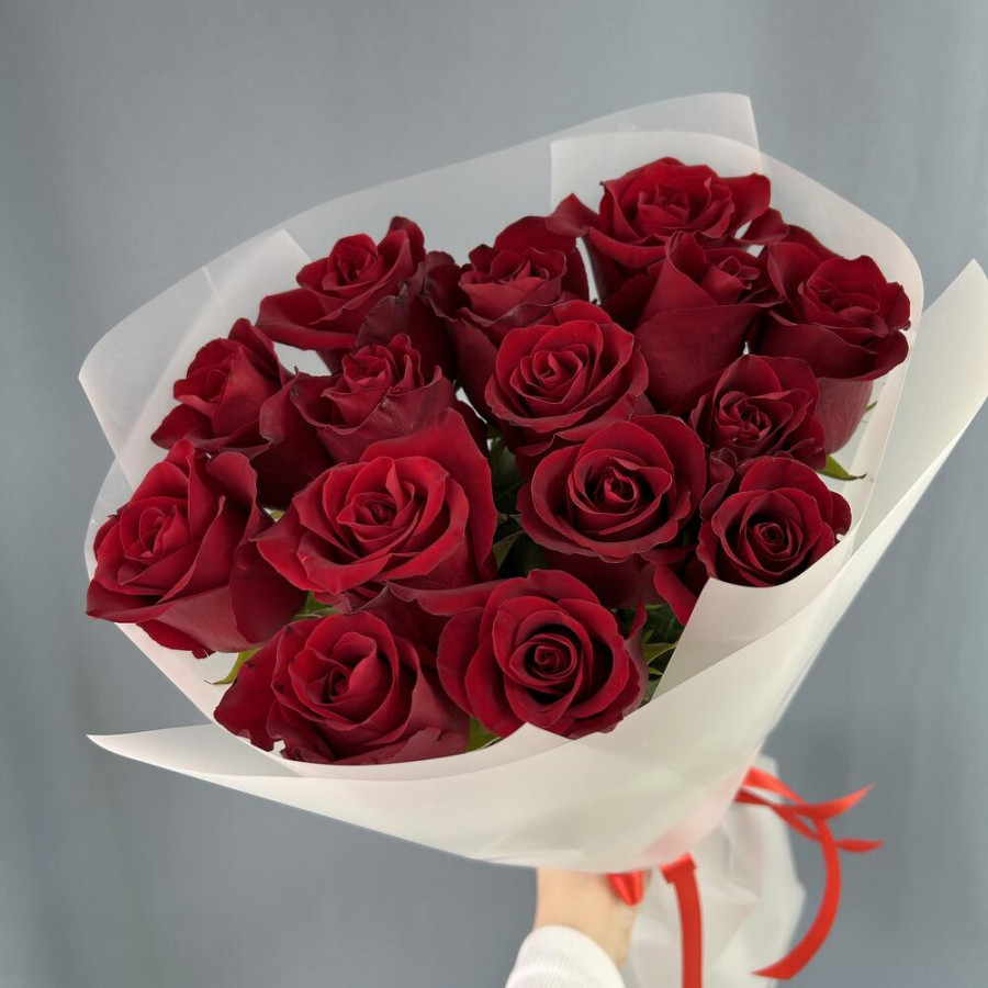 На фото букет из 15 бордовых роз. В составе: роза 15 шт, дизайнерская упаковка 1 шт, атласная лента 1 шт, . Все цветы свежие и ароматные, букет красиво оформлен и отлично подходит для подарка. Доступна доставка цветов или самовывоз.