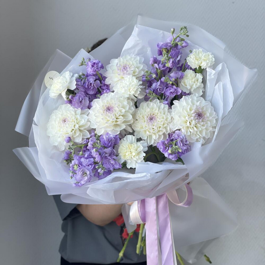 На фото букет «сиреневое облако». В составе: георгина 5 шт, маттиола 4 шт, гвоздика 5 шт, дизайнерская упаковка 1 шт, атласная лента 1 шт, . Все цветы свежие и ароматные, букет красиво оформлен и отлично подходит для подарка. Доступна доставка цветов или самовывоз.